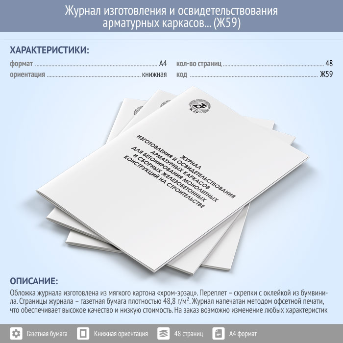Журнал изготовления и освидетельствования арматурных каркасов для бетонирования монолитных и сборных железобетонных конструкций на строительстве (Ф-48) (48 стр., Ж59) в Хотьково купить