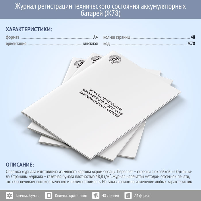 Журнал регистрации технического состояния аккумуляторных батарей (48 стр., Ж78) в Хотьково купить