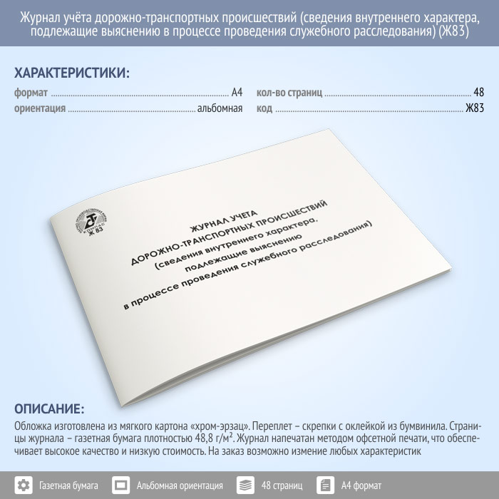 Журнал учета дорожно-транспортных происшествий (сведения внутреннего характера, подлежащие выяснению в процессе проведения служебного расследования) (48 стр., Ж83) в Хотьково купить