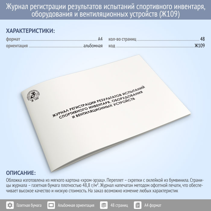 Журнал регистрации результатов испытаний спортивного инвентаря, оборудования и вентиляционных устройств (48 стр., Ж109) в Хотьково купить