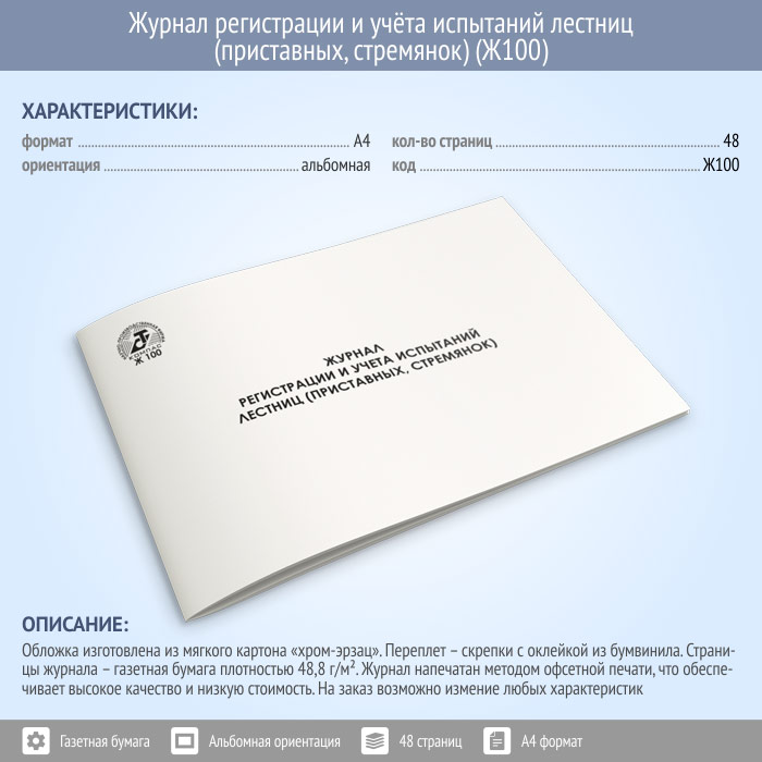 Журнал регистрации и учета испытаний лестниц (приставных, стремянок) (48 стр., Ж100) в Хотьково купить