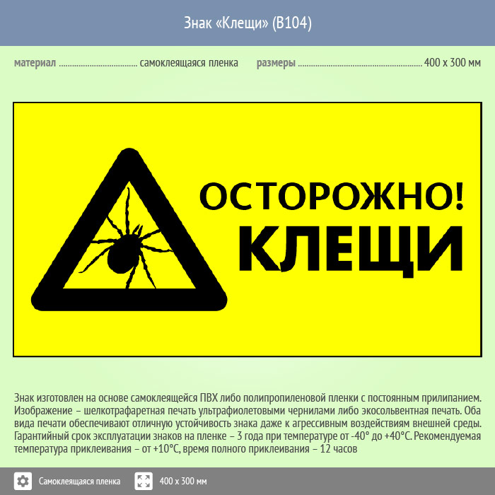 Знак «Осторожно! Клещи», B104 изготавливается в 2-х типоразмерах - 300х200 мм и 400х300 мм