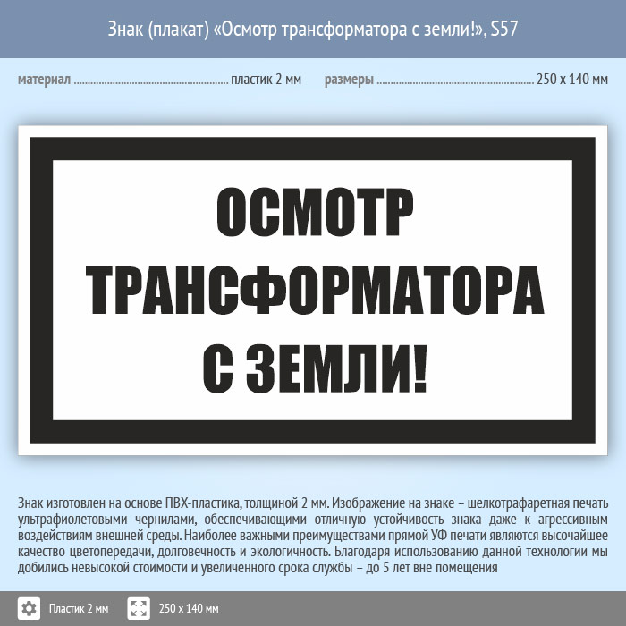 Знак (плакат) «Осмотр трансформатора с земли!», S57 (пластик, 250х140 мм) в Хотьково купить