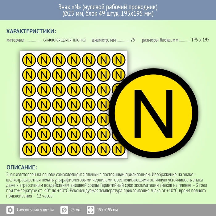 Знак (плакат) «N» (нулевой рабочий проводник), S47 (пленка, диаметр 25 мм, блок 49 штук, 195х195 мм) в Хотьково купить