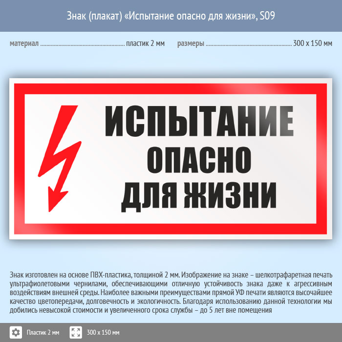 Знак (плакат) «Испытание опасно для жизни», S09 (пластик, 300х150 мм) в Хотьково купить