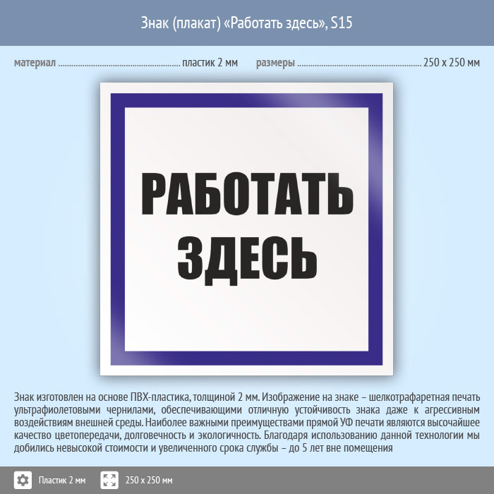 Знак (плакат) «Работать здесь», S15 (пластик, 250х250 мм) в Хотьково купить