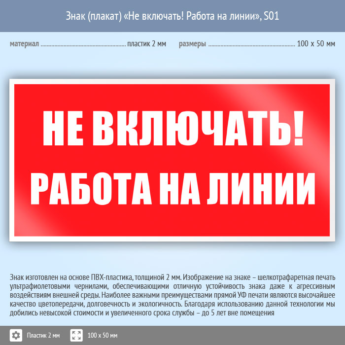 Знак (плакат) «Не включать! Работа на линии», S01 (пластик, 100х50 мм) в Хотьково купить