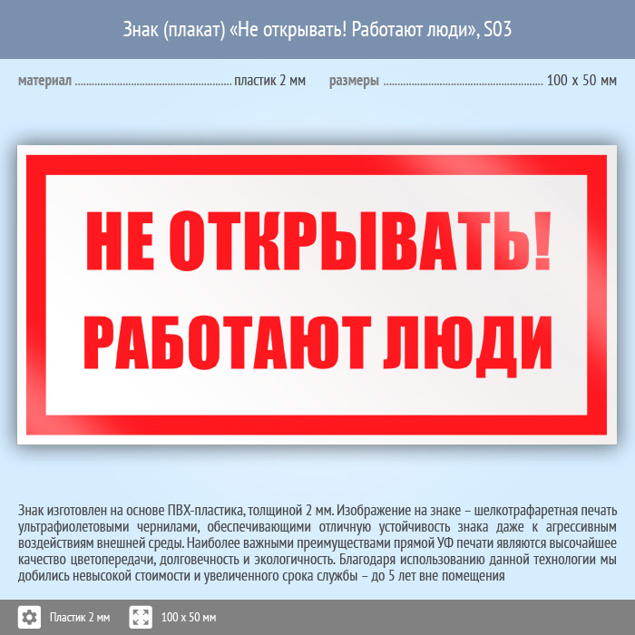 Знак (плакат) «Не открывать! Работают люди», S03 (пластик, 100х50 мм) в Хотьково купить