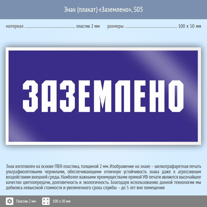 Знак (плакат) «Заземлено», S05 (пластик, 100х50 мм) в Хотьково купить