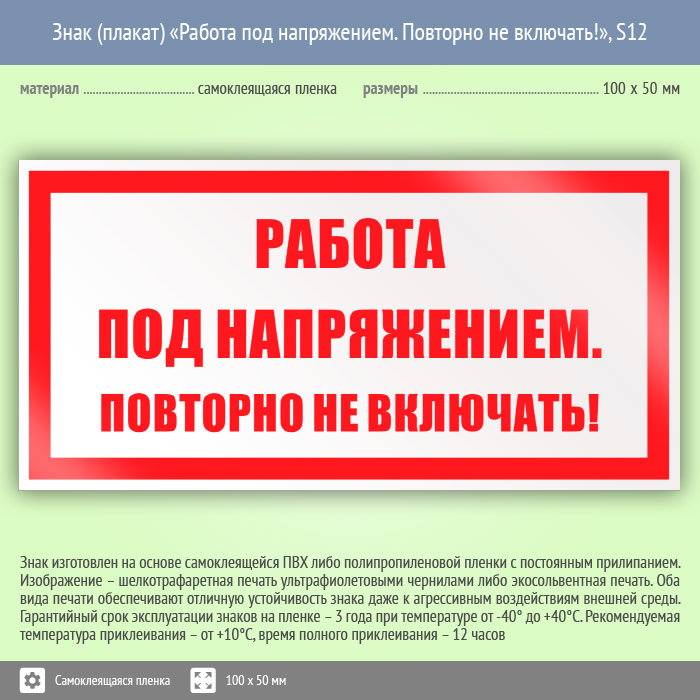 Знак (плакат) «Работа под напряжением. Повторно не включать!», S12 (пленка, 100х50 мм) в Хотьково купить