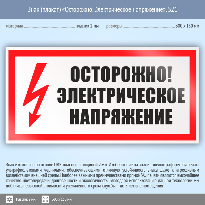 Знак (плакат) «Осторожно. Электрическое напряжение», S21 (пластик, 300х150 мм) в Хотьково купить