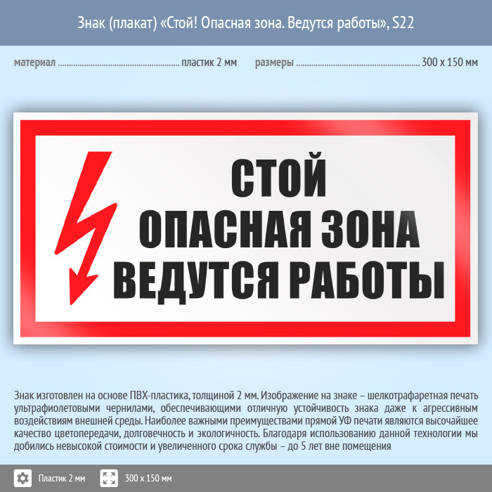 Знак (плакат) «Стой! Опасная зона. Ведутся работы», S22 (пластик, 300х150 мм) в Хотьково купить