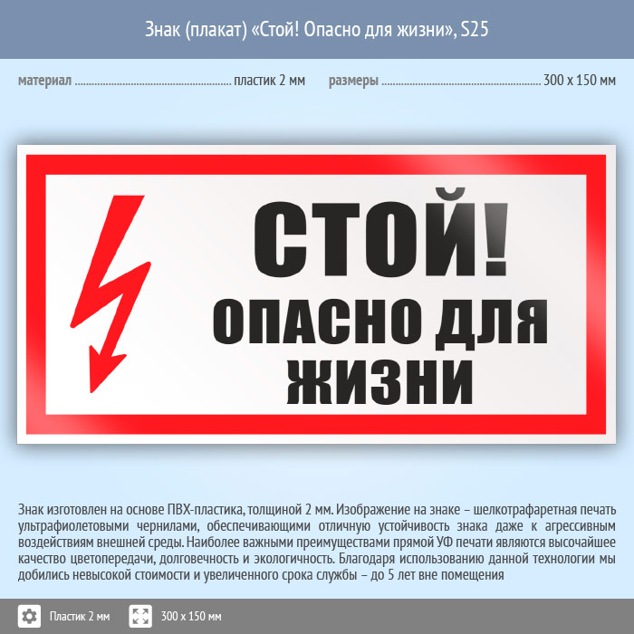 Знак (плакат) «Стой! Опасно для жизни», S25 (пластик, 300х150 мм) в Хотьково купить