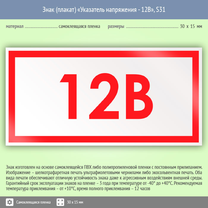 Знак (плакат) «Указатель напряжения 12 В», S31 (50 штук, пленка, 30х15 мм) в Хотьково купить