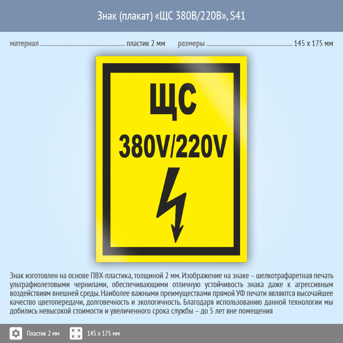 Знак (плакат) «ЩС 380В/220В», S41 (пластик, 145х175 мм) в Хотьково купить
