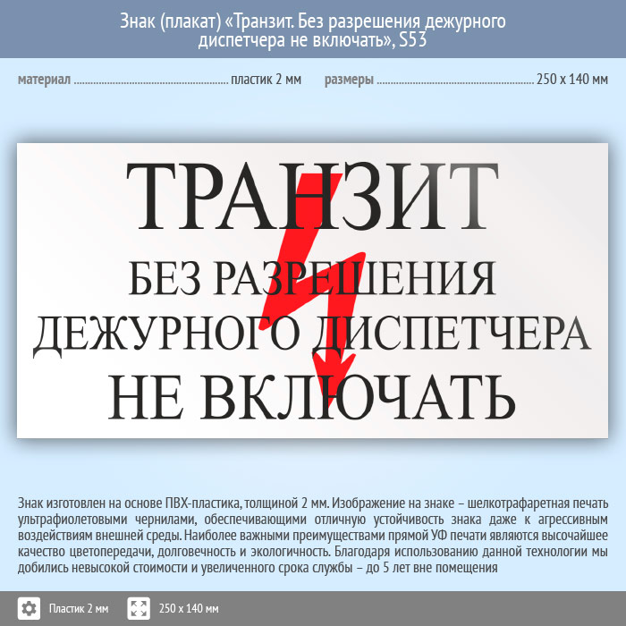Знак (плакат) «Транзит. Без разрешения дежурного диспетчера Не включать», S53 (пластик, 250х140 мм) в Хотьково купить