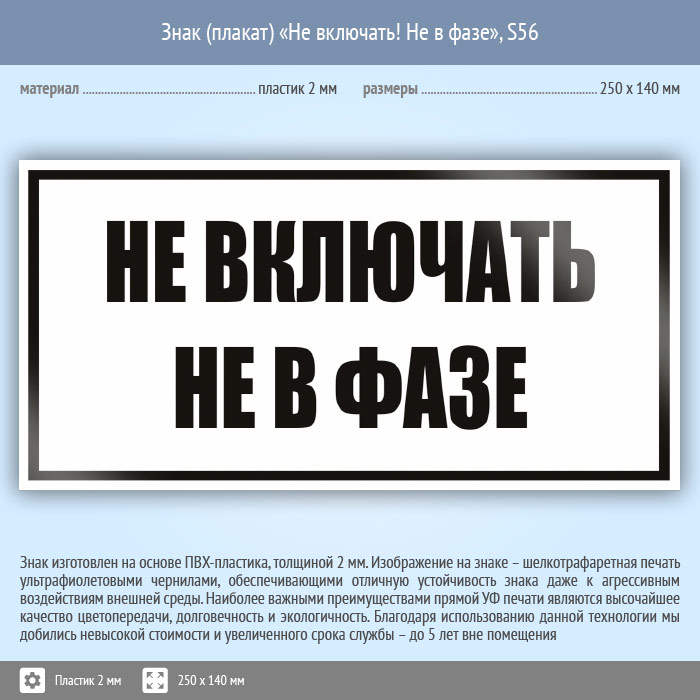 Знак (плакат) «Не включать! Не в фазе», S56 (пластик, 250х140 мм) в Хотьково купить