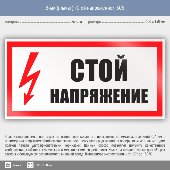 Знак (плакат) «Стой напряжение», S06 (металл, 300х150 мм) в Хотьково купить