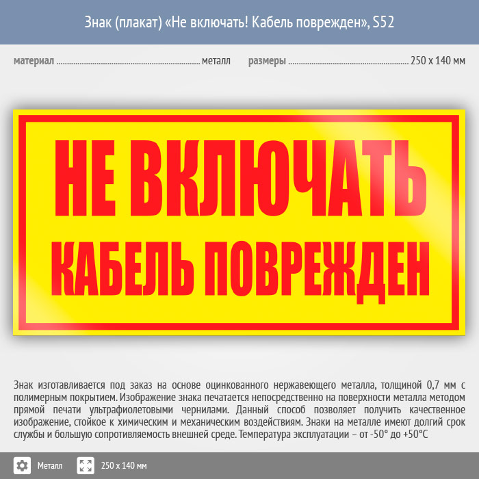 Знак (плакат) «Не включать! Кабель поврежден», S52 (металл, 250х140 мм) в Хотьково купить