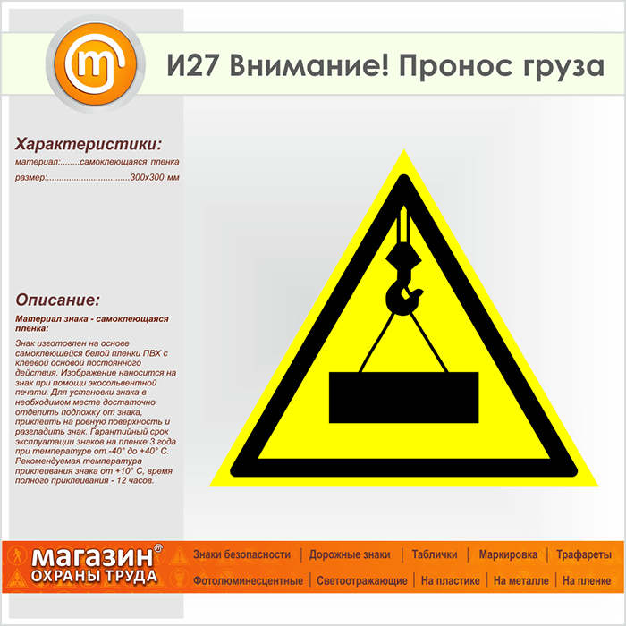 Знак «Внимание! Пронос груза», И27 (пленка, сторона 300 мм) в Хотьково купить