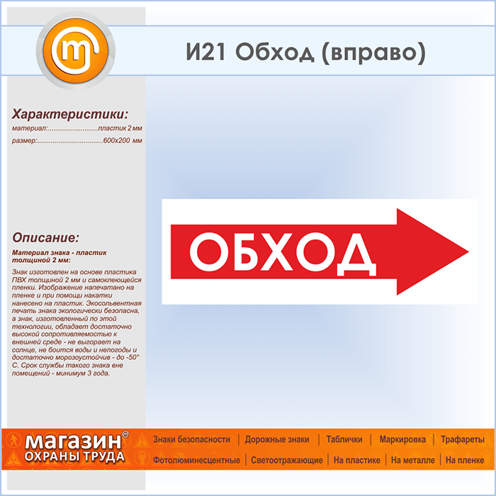 Знак «Обход (вправо)», И21 (пластик, 600х200 мм) в Хотьково купить