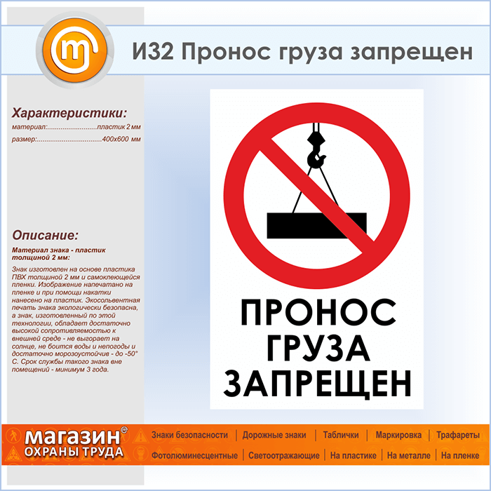 Знак «Пронос груза запрещен», И32 (пластик, 400х600 мм) в Хотьково купить