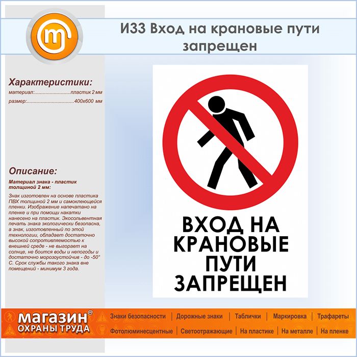 Знак «Вход на крановые пути запрещен», И33 (пластик, 400х600 мм) в Хотьково купить