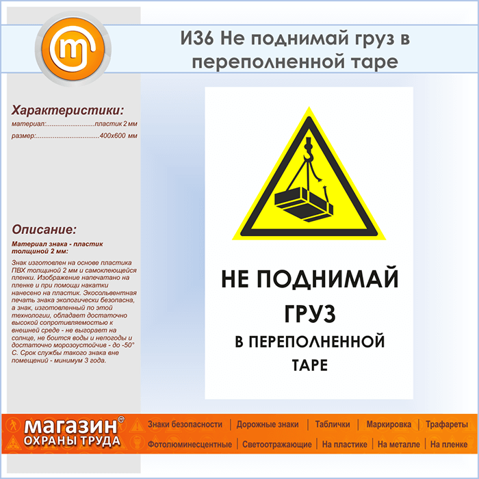 Знак «Не поднимай груз в переполненной таре», И36 (пластик, 400х600 мм) в Хотьково купить