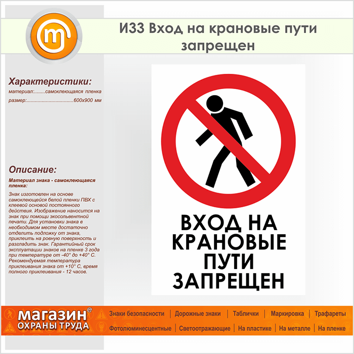 Знак «Вход на крановые пути запрещен», И33 (пленка, 600х900 мм) в Хотьково купить