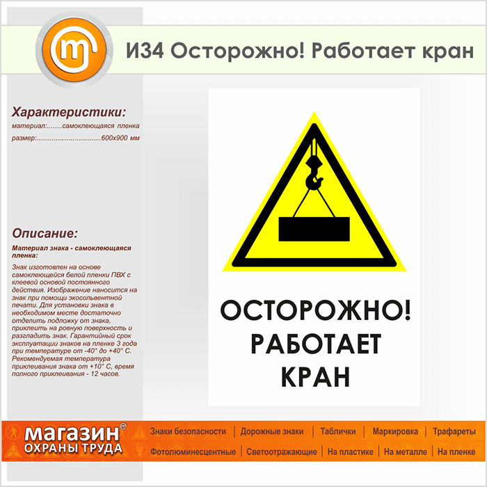 Знак «Осторожно! Работает кран», И34 (пленка, 600х900 мм) в Хотьково купить
