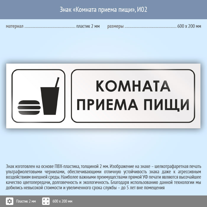 Знак «Комната приема пищи», И02 (пластик, 600х200 мм) в Хотьково купить