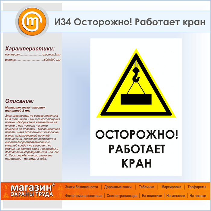 Знак «Осторожно! Работает кран», И34 (пластик, 600х900 мм) в Хотьково купить