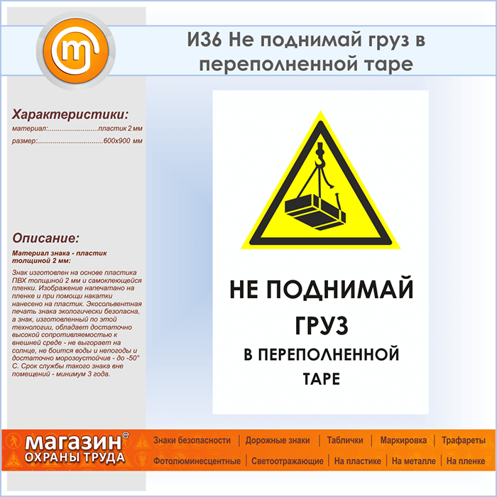 Знак «Не поднимай груз в переполненной таре», И36 (пластик, 600х900 мм) в Хотьково купить