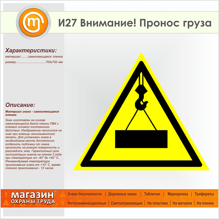 Знак «Внимание! Пронос груза», И27 (пленка, сторона 700 мм) в Хотьково купить