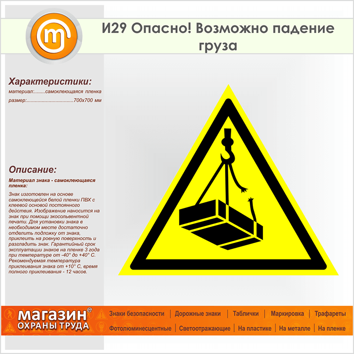 Знак «Опасно! Возможно падение груза», И29 (пленка, сторона 700 мм) в Хотьково купить