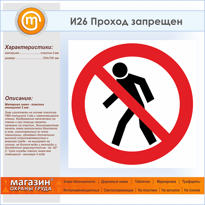 Знак «Проход запрещен», И26 (пластик, 700х700 мм) в Хотьково купить