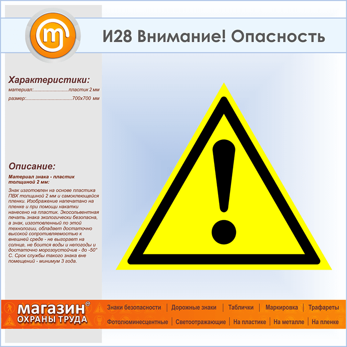 Знак «Внимание! Опасность», И28 (пластик, сторона 700 мм) в Хотьково купить