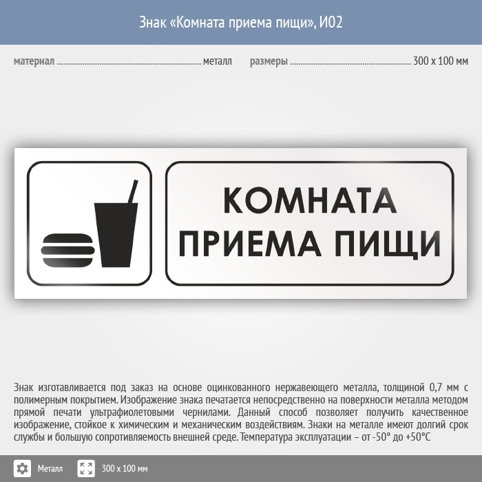 Знак «Комната приема пищи», И02 (металл, 300х100 мм) в Хотьково купить