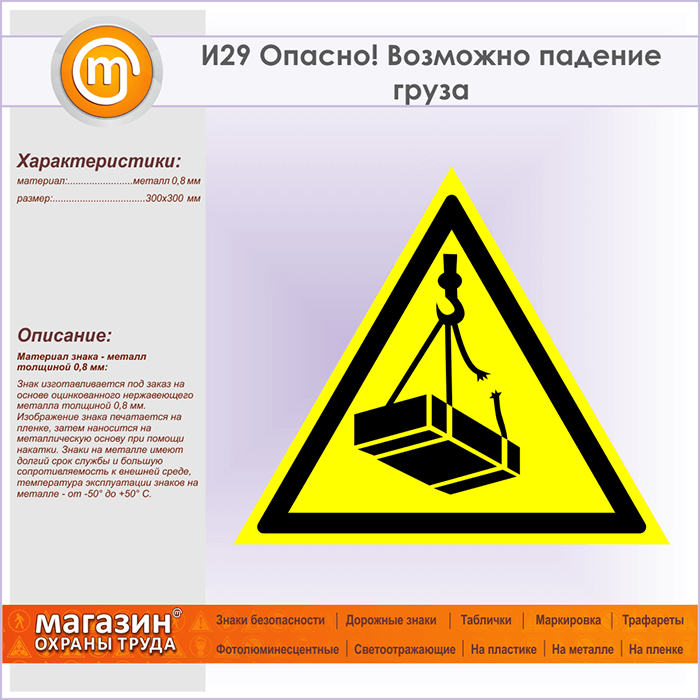 Знак «Опасно! Возможно падение груза», И29 (металл, сторона 300 мм) в Хотьково купить
