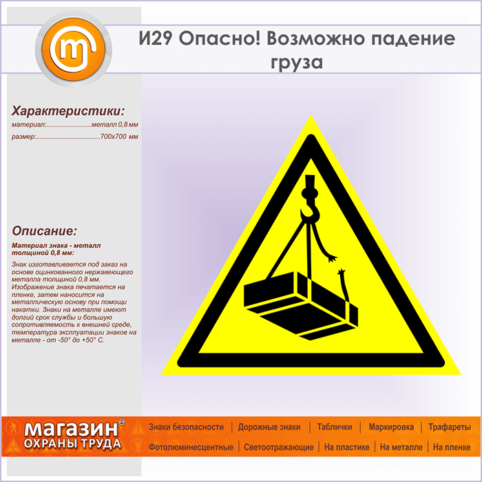 Знак «Опасно! Возможно падение груза», И29 (металл, сторона 700 мм) в Хотьково купить