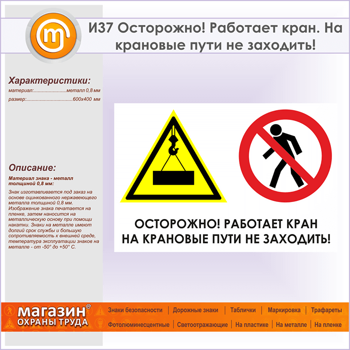Знак «Осторожно! Работает кран. На крановые пути не заходить!», И37 (металл, 600х400 мм) в Хотьково купить