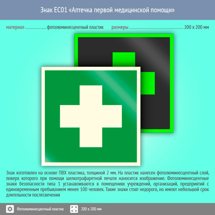 Знак EC01 «Аптечка первой медицинской помощи» (фотолюминесцентный пластик, 200х200 мм) в Хотьково купить