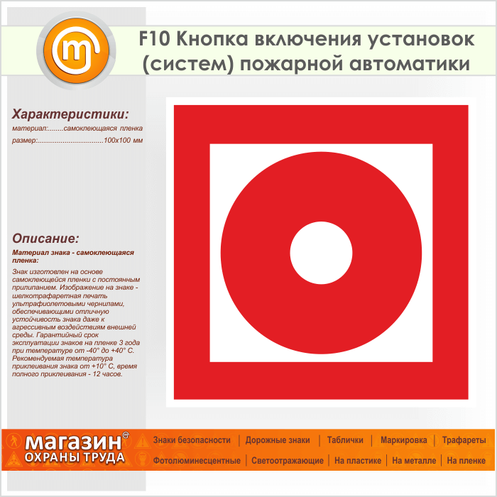 Знак F10 «Кнопка включения установок (систем) пожарной автоматики» (пленка, 100х100 мм) в Хотьково купить