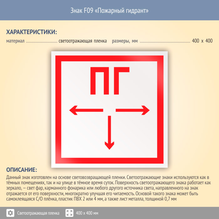 Знак F09 «Пожарный гидрант» (светоотражающая пленка, 400х400 мм) в Хотьково купить