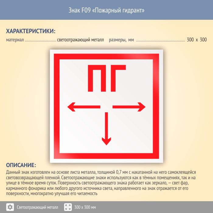 Знак F09 «Пожарный гидрант» (светоотражающий металл, 300х300 мм) в Хотьково купить