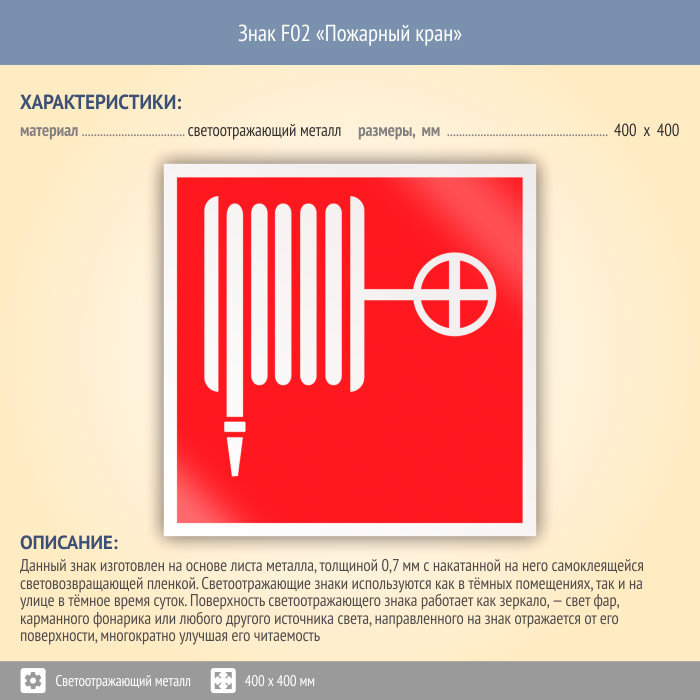 Знак F02 «Пожарный кран» (светоотражающий металл, 400х400 мм) в Хотьково купить