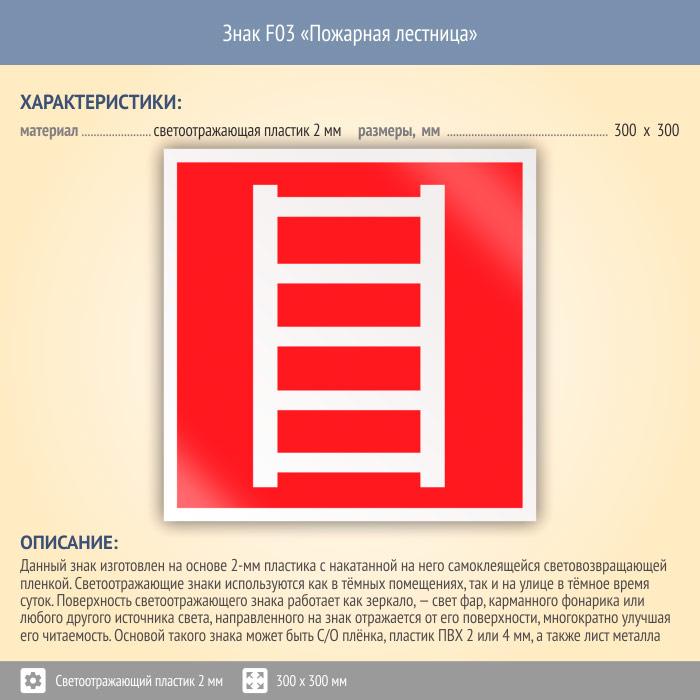 Знак F03 «Пожарная лестница» (светоотражающий пластик, 300х300 мм) в Хотьково купить