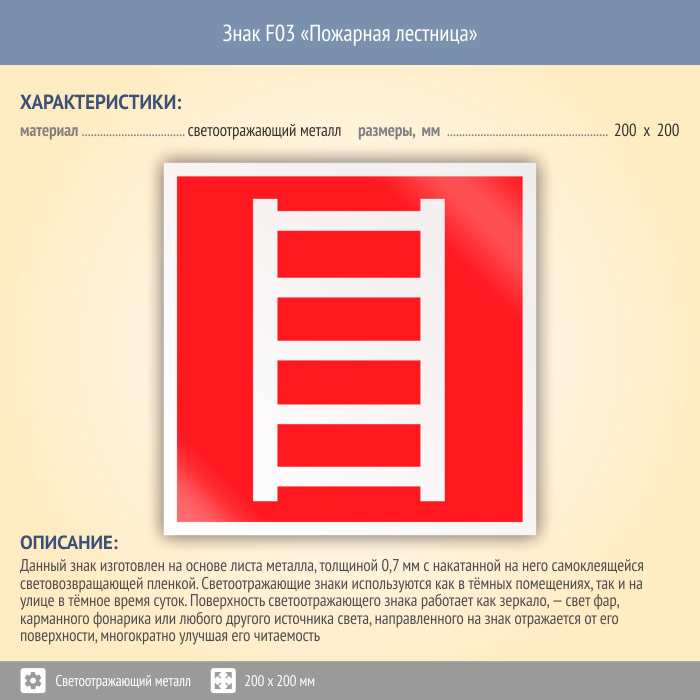 Знак F03 «Пожарная лестница» (светоотражающий металл, 200х200 мм) в Хотьково купить
