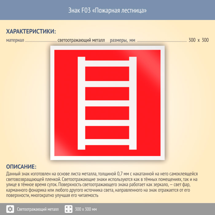 Знак F03 «Пожарная лестница» (светоотражающий металл, 300х300 мм) в Хотьково купить