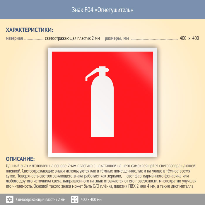 Знак F04 «Огнетушитель» (светоотражающий пластик, 400х400 мм) в Хотьково купить